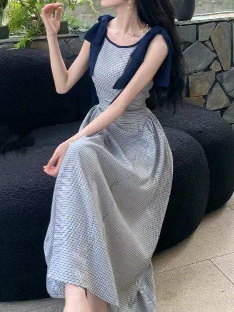 This dress cleverly combines vintage checkers with fashionable ribbon elements to create a unique and elegant temperament. The sleeveless design is simple and generous, fitting the shoulder line and showing the neat beauty of the neck and shoulders. The navy - blue ribbons are decorated on the shoulders, allowing you to adjust the shape at will. Tying them into bows adds a sweet and playful touch, or letting them hang naturally creates a casual atmosphere, injecting changeable possibilities into the outfit.